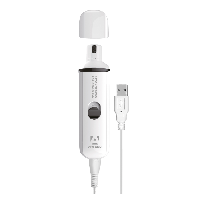 Works to file quickly and safely. Grinder has a protective cover with two openings where the nail can be placed for filing. This helps control the filing and also protects the nail and coat. Cover can also be removed so the whole head can be used for filing. Charge with the included USB cord.