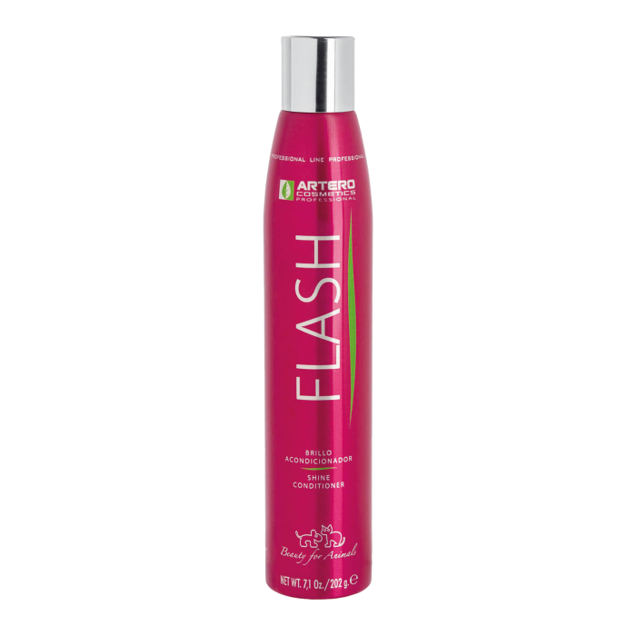 The Artero Flash Shine Conditioner gives extraordinary shine and silky results to all coats. The careful selection of it's components gives a non-greasy, conditioning effect which allows a softner on a dry coat, giving it a shiny invisible film that prevents tangling.