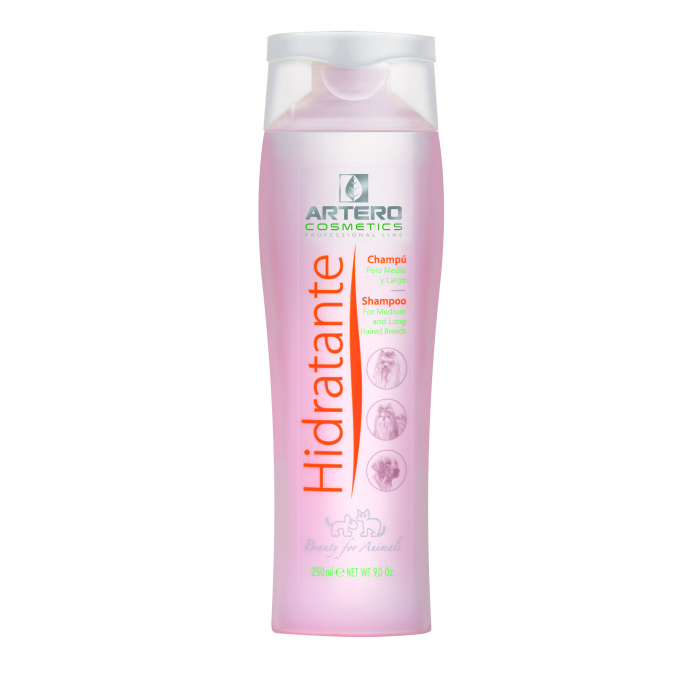 The Artero Hidratante Moisturizing Shampoo is an ideal shampoo for long-haired breeds and on dry and deteriorated coats. It is made with a very mild base of natural surface-active agents. The relaxing properties of this shampoo produce a moisturizing effect on the skin. This product deeply nourishes the coat, and the moisturizing and oil restoring components help recover the texture of the hair, leaving it soft and shiny.