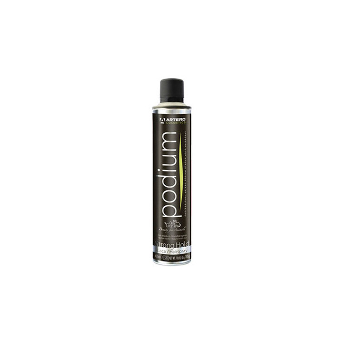 Artero Podium Wet Hairspray which provides complete hold. Stands up to even intense shaking. Perfect for fixing a topknot, especially for shows, expos, etc. Suitable for use on black coated dogs as no product left.