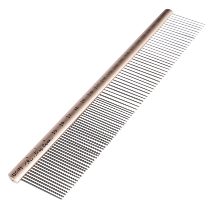 The Chris Christensen 9" Competition Comb™(#509) is designed by professionals for professional Salon Groomers, Competition Groomers, Dog Show Enthusiasts and even At-Home Groomers aiming for greater consistency in their grooms. For an industry first, this comb is equipped with measurement lines on both sides of the spine, both centimeter and inch measurements. This feature allows any groomer the ability to check their work with ease for consistency in cut length throughout the body and legs, and to ensure conformity to breed standard cuts. Perfect for any coat type requiring scissor work; as well as other breeds including wire coats, drop coats, double coats, and setter/spaniels. Each comb comes packed in a high-quality protective case to protect your comb for storage and during transport.