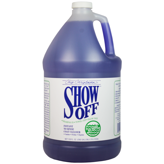 Chris Christensen Show Off No Rinse Shampoo renews color clarity, diminishes soiled spots on all coat colors, and creates a radiant glow in just minutes with this no-rinse cleaner. Show Off is the perfect solution when you are under limited time preparing for the show ring or when your pet cannot be bathed for any reason. This no rinse shampoo is also great on a daily basis to clean dirty feet or faces. All coat colors become brighter while making the whitest white possible without bleaching agents.