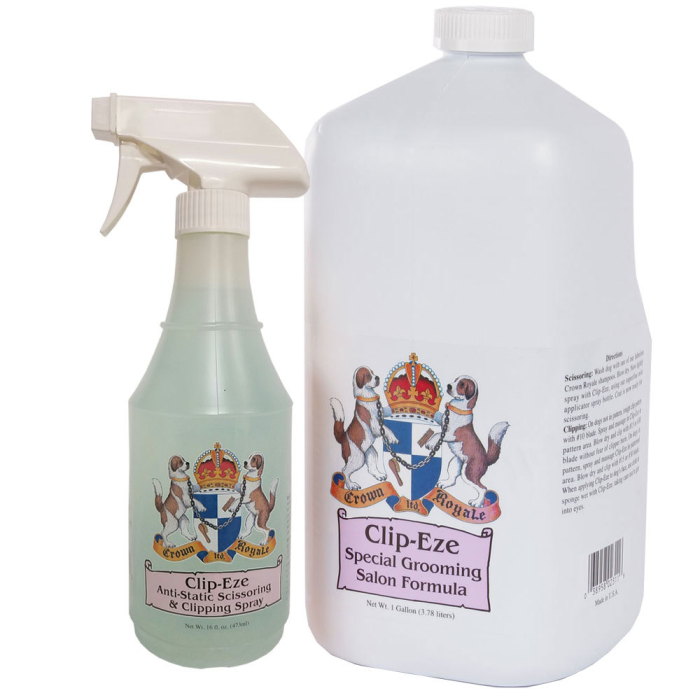 Crown Royale Clip-Eze is formulated to lubricate hair, prevent clipper burn and eliminate static, making scissoring and clipping your dog a pleasure. This amazing product can also cut your trimming time in half! Helps scissors will stay sharp and lubricated.