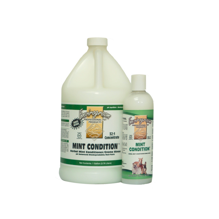 Mint Condition by Envirogroom is premium conditioner is formulated and packed with natural ingredients to leave the skin and coat in Mint Condition. Fortified and balanced it will moisturize, relieve itching and leave the coat shiny and manageable without build up or residue. Great for dogs, cats, puppies, kittens and horses. Works great with bathing systems and safe to use with flea control drops.