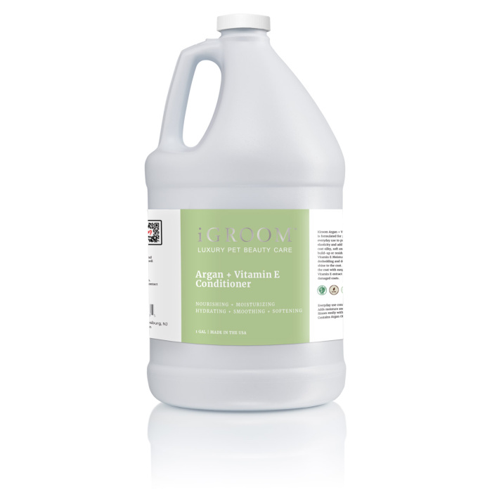 iGroom Argan + Vitamin E Conditioner is specially formulated for the daily needs of pet care professionals. This conditioner protects the hair’s natural elasticity and provides added moisture. It leaves the coat silky, soft and manageable without build-up or residue. iGroom Argan + Vitamin E Moisturizing Conditioner assists with deshedding and detangling, while also adding shine to the coat. It protects and smooths the coat with easy rinsing. Argan oil and Vitamin E extract work together to help repair dry and damaged coats.