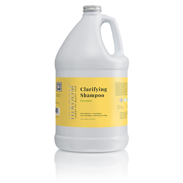 iGroom's Clarifying Shampoo will keep your dog's coat soft, shiny & super clean! Developed with biodegradable ingredients that not only soothe & protect but create a luxurious lather that easily rinses for busy groomers & pet parents. Clarifying PineApple shampoo is bright & fresh, with crisp apple aromas, warm pineapple and clean, spiced green pine.