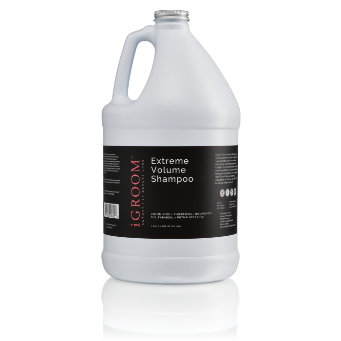 Naturally inspired to thicken and volumize from root to tip, leaving coat full, lush and strong. Repair damage while intensely cleaning. Uplift fine and limp coats. Formulated with hydrolyzed proteins complex, Extreme Volume Shampoo has low viscosity. Use with iGroom Extreme Volumizing Conditioner.