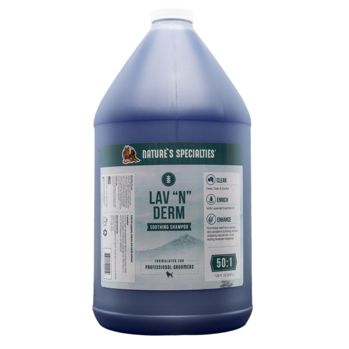 Lav-n-Derm is a calming, gentle shampoo with the invigorating fragrance of lavender that is known for its antiseptic value. Groomers have told us that for cats "it's like catnip" so beware, you may enjoy yourself massaging it into your loving companion. Contains lavender oils that is known for its calming properties in aromatherapy. Great for irritated skin with burns or small abrasions. Even though this shampoo may be diluted up to 50:1, when using it for an antiseptic purpose, it is recommended to increase the concentration to 24:1 or 12:1 depending on the severity of the skin condition. Our Mystic Lavender® Cologne complements this shampoo great fragrance. Safe on dogs, cats, kittens and puppies