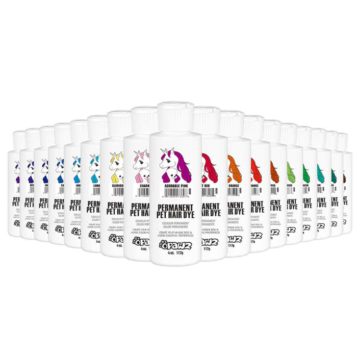 Get bright and fashionable color lasting 20+ washes with OPAWZ Permanent Dog Hair Dyes. Specially formulated for use on dogs and horses. Non-toxic and gentle on the pet's coat. For professional creative groomer use.