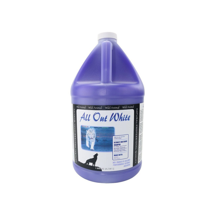 All Out White is an 50:1 ultra high concentrate whitening shampoo that does not contain soap or detergent. All Out White makes white coats whiter and brighter and leaves the coat soft and fluffy. All Out White gently removes grease, oil, dirt, food, and pool stains. All Out White is mild, pH balanced, natural, biodegradable, and safe to use with flea control drops. Formulated for dogs, cats, horses, rabbits, puppies, kittens, ferrets, and farm animals.